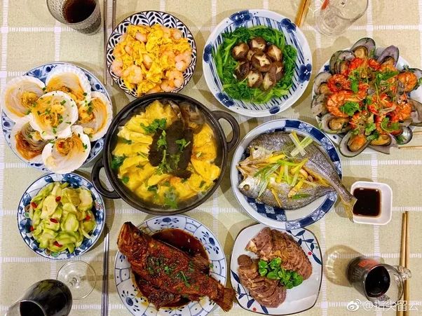 在中国每年消费的6500万吨海鲜里,只有1500万吨是捕捞的,其余5000万吨都来自水产养殖农场。而日本90%的海鲜都来自捕捞。多亏了海鲜养殖,普通中国百姓可以买到便宜的海鲜,日常三餐可以吃得起海鲜。下面是典型中国家庭的团圆饭,你可以看到很多食材都是海鲜。