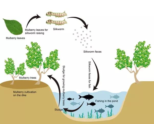 在完全不知道“可持续发展”这个概念的情况下,中国农民利用这个鱼-桑-蚕组成的生态系统已经有几千年历史。如今,这个系统发展成对同一片土地的多次循环利用:
