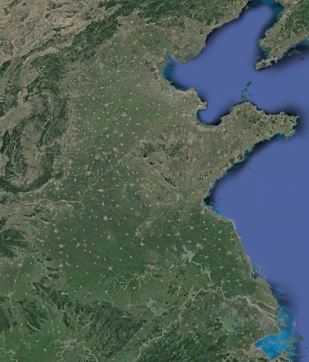 中国宝贵的土地资源是怎么使用的呢?下一站我们访问华北平原。这是中国大部分农作物的产地。(下图从上到下距离1500公里)