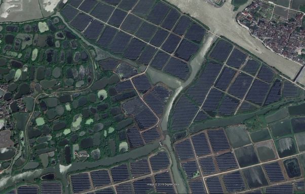从谷歌地图上你可以看到,太阳能供电的鱼塘已经开始替代桑基鱼塘。湖州的部分地区已经装上了太阳能电池板。