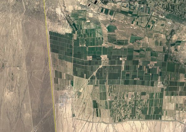 明显看出,中国一侧的绿色农田更多,哈萨克斯坦一侧基本就是荒原。