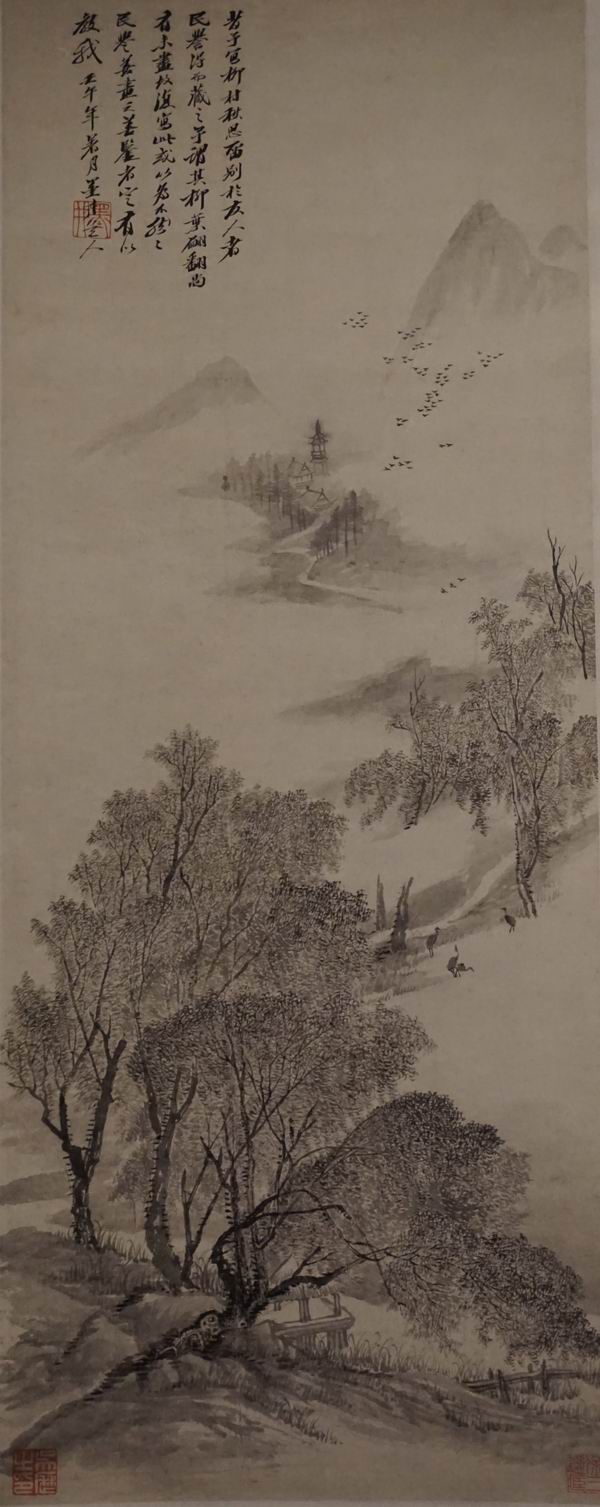 下图为吴历画《柳村秋思图》,此图近景描绘数株岸柳,枝叶错落翩翻,随风摇曳,渲染出秋思的创作主题。远景层峦起伏,飞鸟凌空。画面幽淡辽阔,动静相间。吴历绘画取法自然、出宋入元,位列“清六家”。他的作品在保留传统文人画风的同时,在自身宗教信仰的影响下,主题颇多涉及社会现实、人民生活疾苦,呈现出独特的面貌。