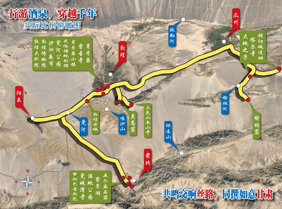 丝绸之路在敦煌分叉,北边的玉门关往北丝绸之路,经哈密、库车,沿着天山山脉向西。南丝绸之路出阳关,经若羌、且末、和田,沿着喀喇昆仑山脉向西。两条路之后又会在新疆喀什汇合。