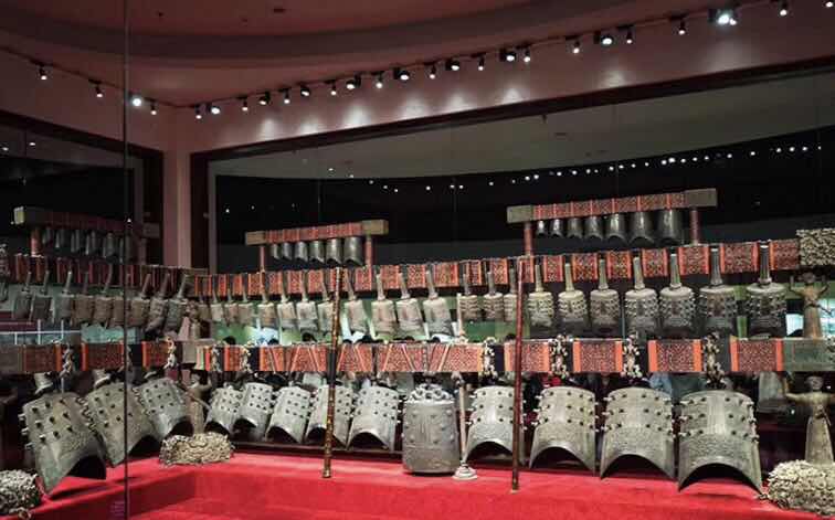 中国古代大型打击乐器,兴起于西周,盛于春秋战国直至秦汉。曾侯乙编钟,是由六十五件青铜编钟组成的庞大乐器,战国早期文物。它高超的铸造技术和良好的音乐性能,改写了世界音乐史,被称为“稀世珍宝”。现藏于湖北省博物馆。