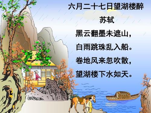 黑云翻墨未遮山,白雨跳珠乱入船。卷地风来忽吹散,望湖楼下水如天。