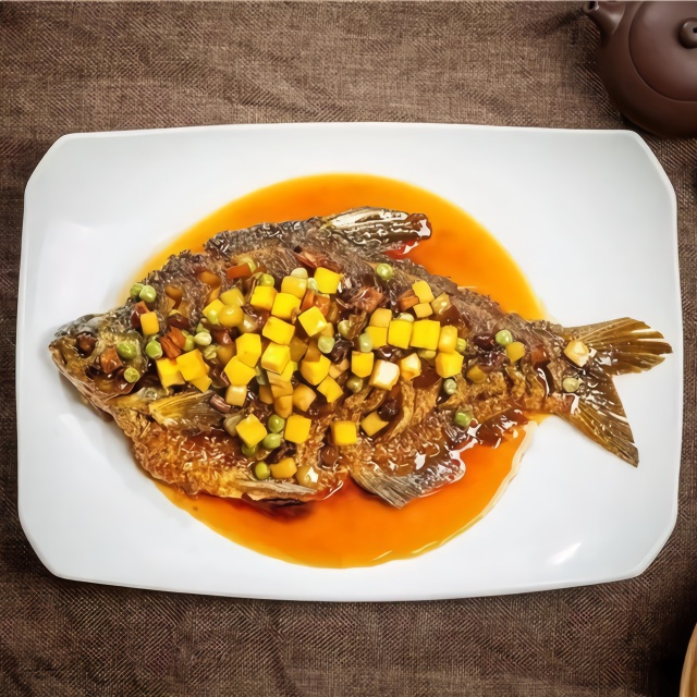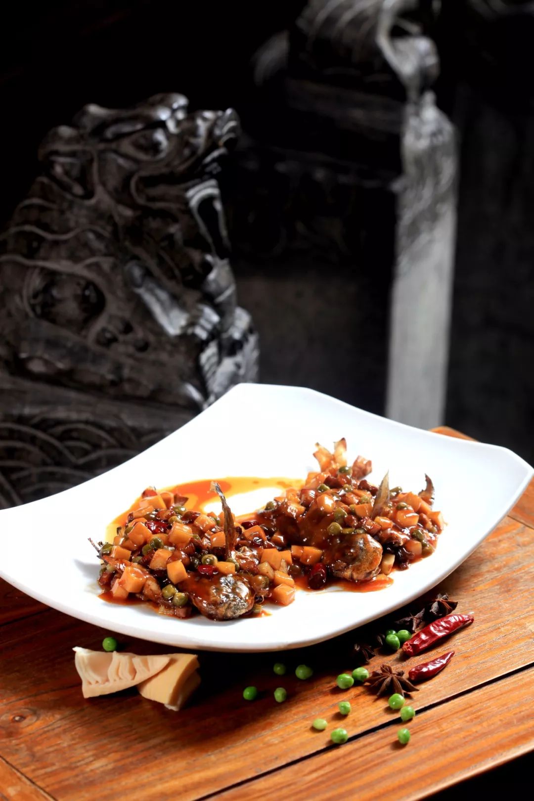 一道干烧鲳鱼,颜色油润红亮,鱼肉滑嫩味厚,八宝丁味美怡人,要是再配一碗米饭,那滋味,绝配。