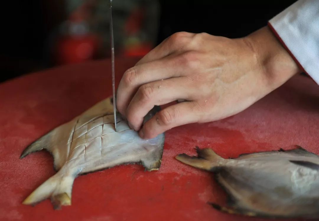 鲳鱼干煎的也好吃,要选扁平宽厚的鲜鲳,竖切大片,略略腌渍风干,不是旺火油炸而是用小火慢慢煎透,干香咸鲜,配一个玉米贴饼子,实在是妙。