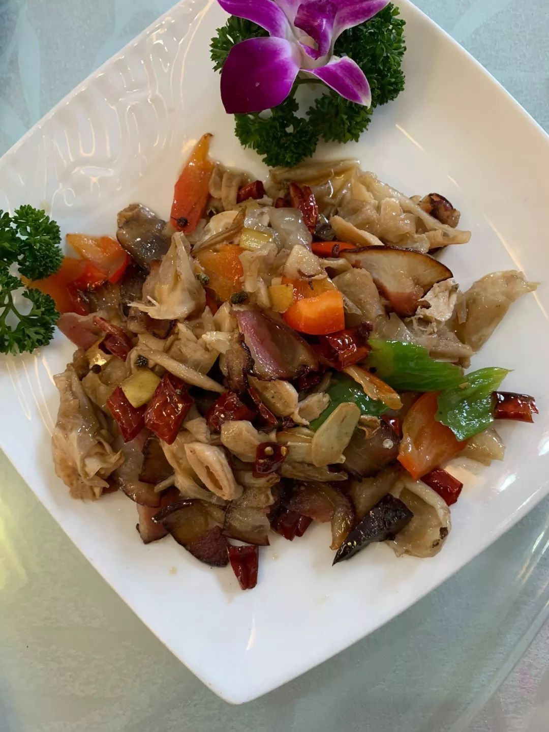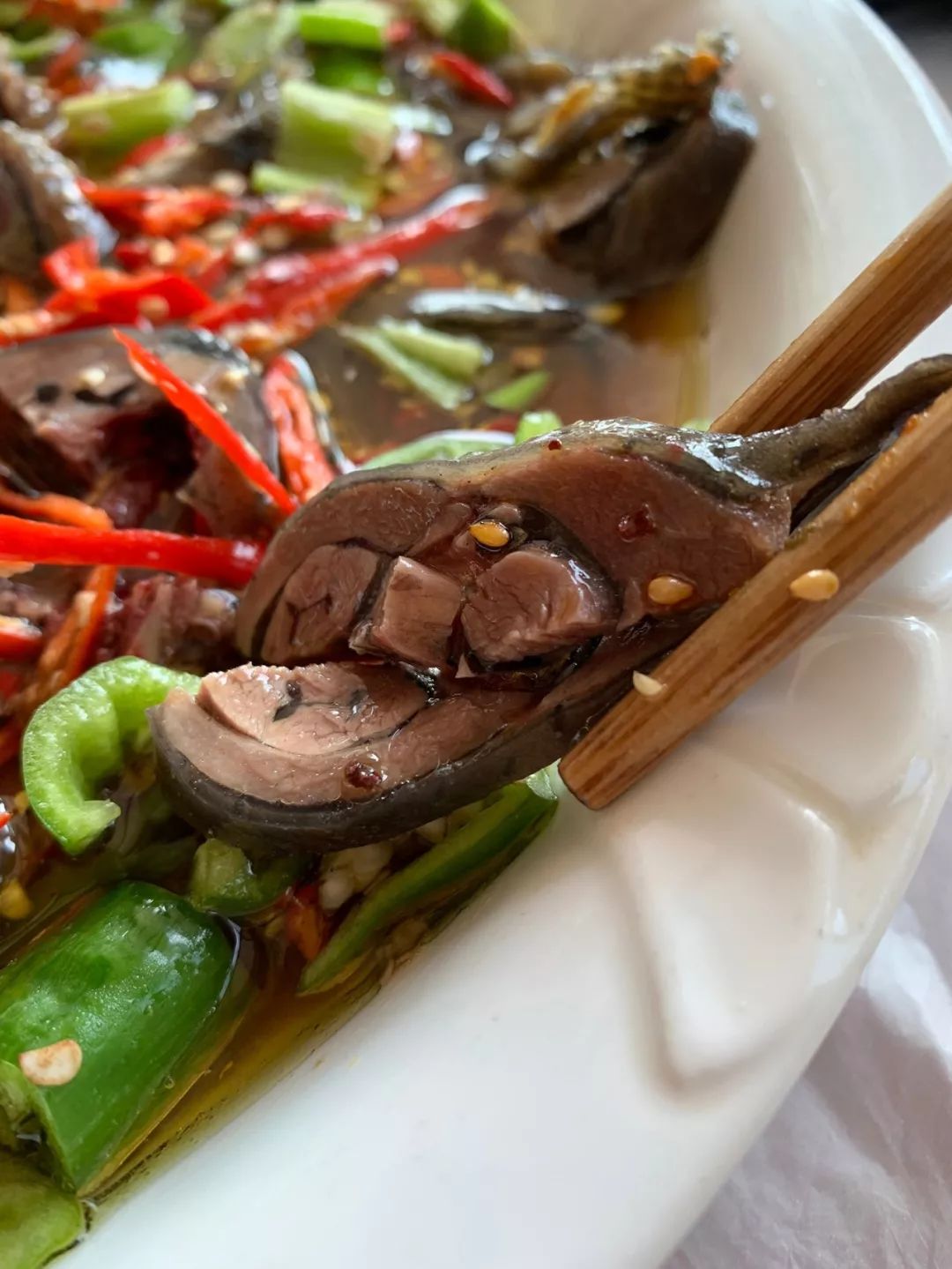 藤椒口味的白斩乌骨鸡,热辣鲜香。藤椒配合着小米辣、青椒,口感层次丰富,入口先是微麻微辣,咀嚼片刻后,藤椒的味道开始发散。藤椒的麻辣裹着小米辣的清辣,在舌尖舞动,让人忍不住夹上一块鸡肉,将这种跳脱的麻辣感压上一压。“你方唱罢我登场”,这就是藤椒独有的魅力。