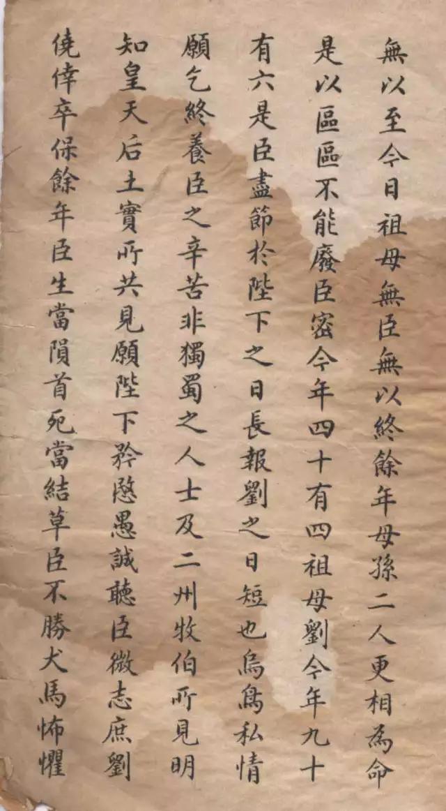 臣密今年四十有四,祖母刘今年九十有六,是臣尽节于陛下之日长,报养刘之日短也。乌鸟私情,愿乞终养。臣之辛苦,非独蜀之人士及二州牧伯所见明知,皇天后土,实所共鉴。愿陛下矜悯愚诚,听臣微志,庶刘侥幸,保卒余年。臣生当陨首,死当结草。臣不胜犬马怖惧之情,谨拜表以闻。