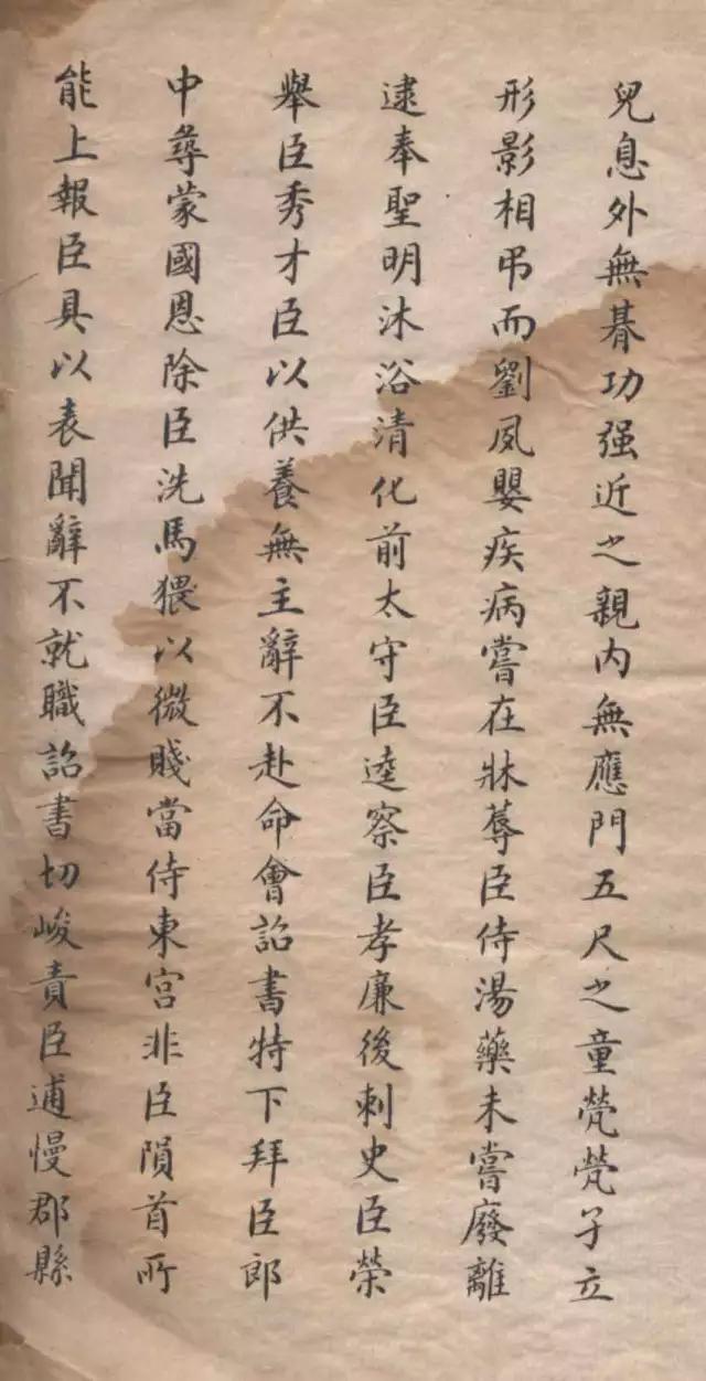 臣密言:臣以险衅,夙遭闵凶。生孩六月,慈父见背;行年四岁,舅夺母志。祖母刘悯臣孤弱,躬亲抚养。臣少多疾病,九岁不行,零丁孤苦,至于成立。既无伯叔,终鲜兄弟,门衰祚薄,晚有儿息。外无期功强近之亲,内无应门五尺之僮,茕茕孑立,形影相吊。而刘夙婴疾病,常在床蓐,臣侍汤药,未曾废离。(刘悯 一作:刘愍;孑立 一作:独立)