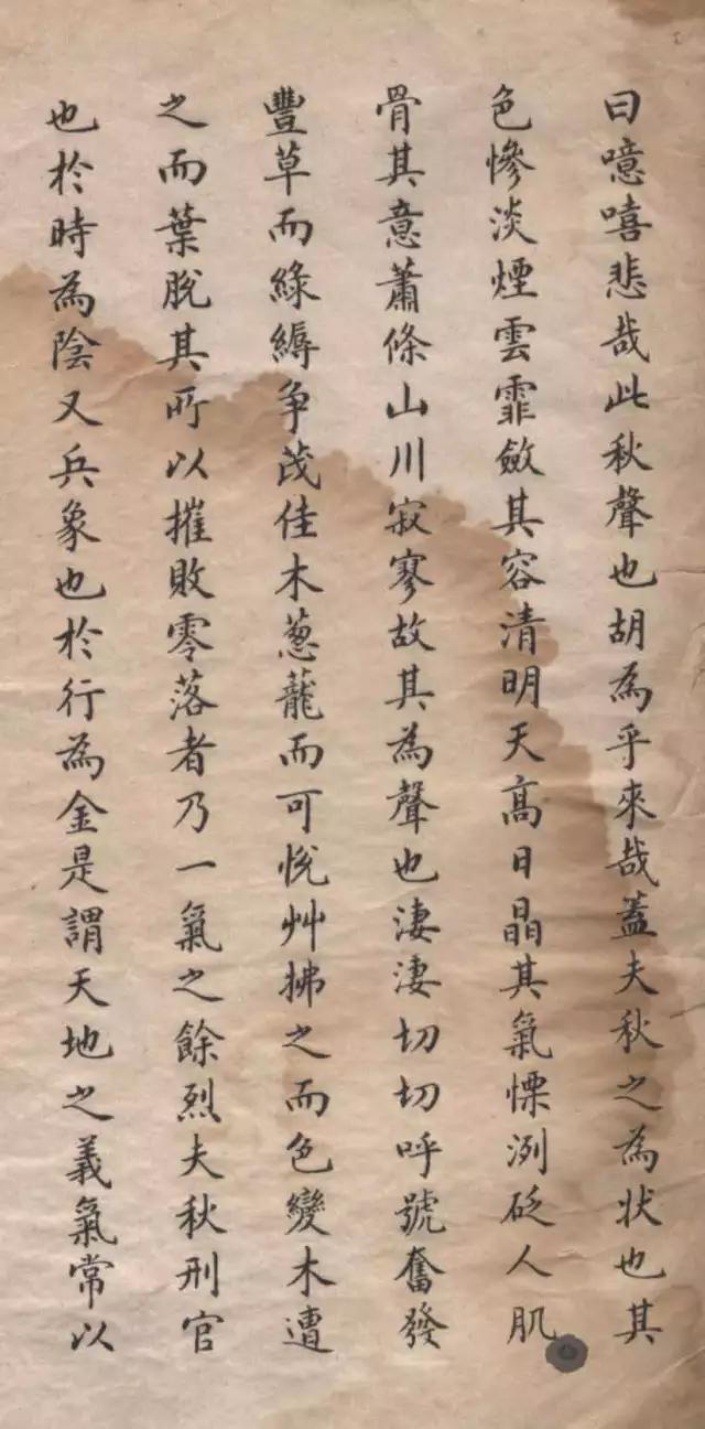 “嗟乎!草木无情,有时飘零。人为动物,惟物之灵;百忧感其心,万事劳其形;有动于中,必摇其精。而况思其力之所不及,忧其智之所不能;宜其渥然丹者为槁木,黟然黑者为星星。奈何以非金石之质,欲与草木而争荣?念谁为之戕贼,亦何恨乎秋声!”