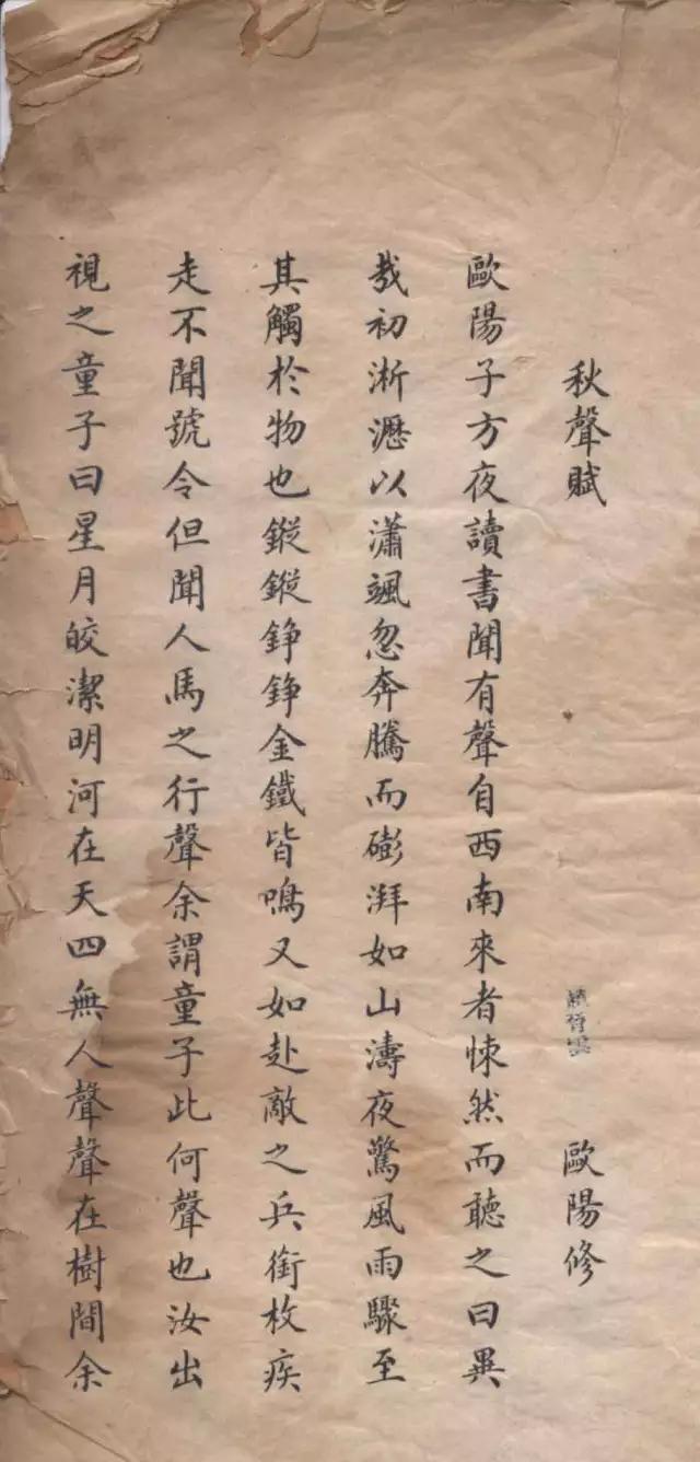欧阳子方夜读书,闻有声自西南来者,悚然而听之,曰:“异哉!”初淅沥以萧飒,忽奔腾而砰湃,如波涛夜惊,风雨骤至。其触于物也,鏦鏦铮铮,金铁皆鸣;又如赴敌之兵,衔枚疾走,不闻号令,但闻人马之行声。予谓童子:“此何声也?汝出视之。”童子曰:“星月皎洁,明河在天,四无人声,声在树间。”