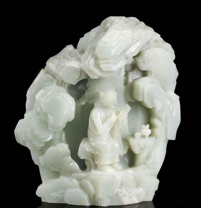 此山子雕工利落,层次丰富,生动刻画阿必达尊者端坐石窟中,旁边摆放着香炉及香盒,一手执拿经书,构图跟五代高僧贯休作画的十六罗汉图非常接近。乾隆皇帝于1757年第二次南巡期间,到杭州西湖圣恩寺礼拜,并首次看到该寺收藏的贯休十六罗汉图,对之大为欣赏,不但亲笔在画上题字,亦命宫廷画师丁观鹏仿画。皇帝对十六罗汉图珍重不已,朝廷亦出现大量以罗汉图为蓝本的艺术品,其中以玉器为多。如本山子上刻有乾隆年款及御题诗,可见乾隆帝非常珍爱以十六罗汉图为题材的器物。故宫博物院藏一件嵌玉十六罗汉大屏风,上面阿必达尊者造型与本拍品非常相似,均是以贯休作品为蓝本。另外山子底部刻写《十六》,表示主题人物为第十六罗汉阿必达尊者,可从中推测当时供养的罗汉像不止一尊,非常有可能是一整套十六或更多尊。咸丰十一年,太平天国叛军攻陷杭州,圣恩寺遭劫难,贯休原作从此流失,幸而通过各类献予乾隆皇帝的罗汉图文物如本山子,使今人仍能从中窥探贯休真迹之风采。1758年,清廷平定准噶尔叛乱,收复新疆,使得清廷能取得上好的玉料,也因此能作出精美的大型玉雕作品。此件玉山正是乾隆皇帝文治武功鼎盛时期的最佳见证。