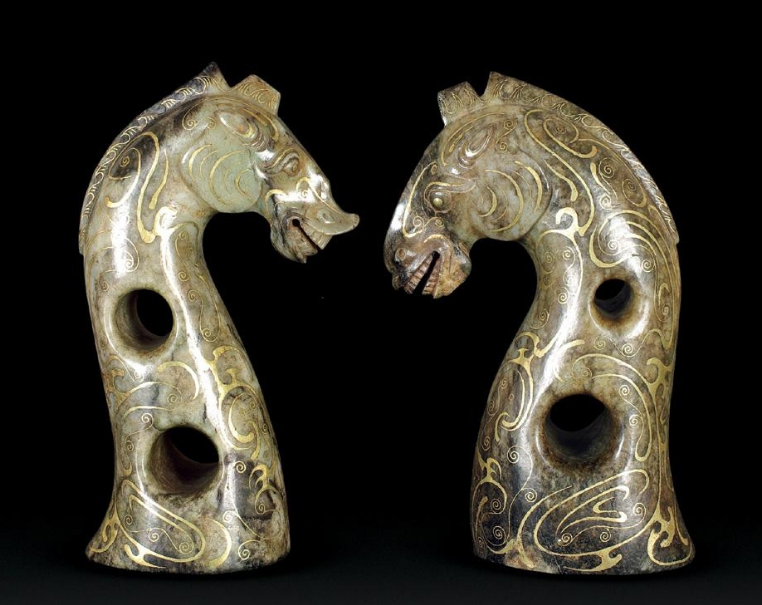 白玉质地,通体受沁呈褐色。圆雕一对马头,工匠以非常精湛的工艺把马首表现的十分形象,贴切写实。马眼炯炯有神,张口,露出整齐的牙齿,鬃毛向上,威风凛凛。通体错以金线,富丽堂皇。马颈处钻两圆孔。元代蒙古族统治中国,蒙古又是马背上的民族,对马有一种特殊的感情,故此对马首为元代蒙古民族的代表作品。