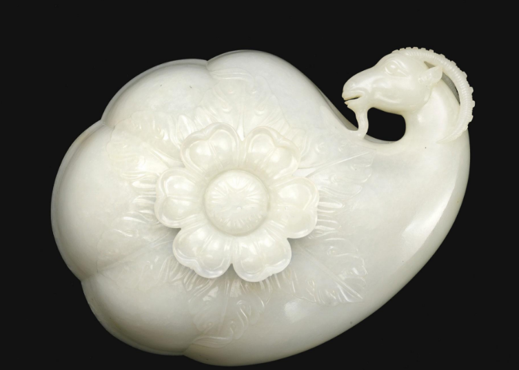 此杯玉质净白,工艺细腻,造形阳刚有力,羊首面容生动,下颏须胡彰显力度,线条微弯融入瓜形杯身,杯足作莲花盛放,外壁细琢蜷曲枝叶。玉色乳白净洁,彷若世外之物,深得乾隆帝慕奇之好。