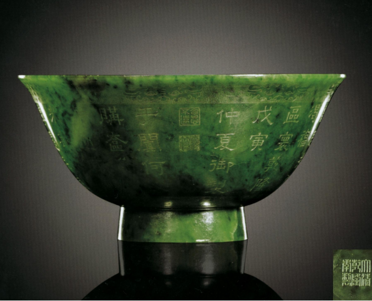 此和阗青玉茶碗,玉质莹润雅致、微泛墨斑,正合清宫偏爱色深美玉之喜好、实为珍品。