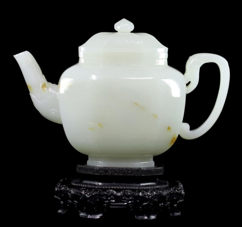 此壶白玉料,局部留皮,通体无暇无裂,油润莹细,玉泽匀净,为和田籽料上品。局部染色,为乾隆时期玉作特色。器形仿紫砂八方壶形制,壶身、曲流、环柄、壶盖、壶钮、圈足,均以四方侧角构成,实为八方。壶钮至圈足自上而下八根线条将壶身分为八个块面,壶盖、曲流、环柄、圈足顺其巧妙延续,变化规正有序,全身贯通。雕刻线条流畅,线面挺括平正,轮廓分明,给予人们干净利落,明快挺秀之感。变化合度,器型章法纯正,给人以平稳庄重之态,可谓「方中寓圆,方中求变,口盖划一,刚柔相称」。壶身循「良玉不雕,美言不文」之则,光素无纹,仅壶嘴与环柄略雕龙纹以作修饰,线条柔和精致。