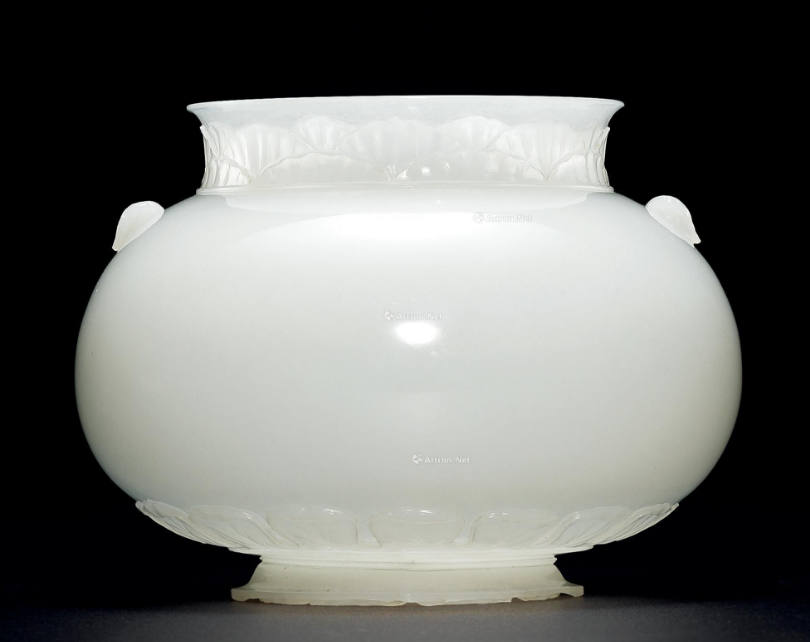 罐白玉质,圆口微撇,短颈,深膛,方圆形足外撇罐白玉质,圆口微撇,短颈,深膛,方圆形足外撇。腹部光素无纹饰,颈琢叶纹,肩两侧饰对称叶形耳,近足处环饰花瓣纹,足底饰四层花瓣图案,俯视器底,足部花卉与胫部花卉于视觉上合为一朵大花,别具匠心。
