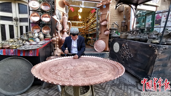 行走在坎土曼巴扎、维吾尔医药巴扎、花盆巴扎……四代五代传承人的招牌随处可见,阿地力江·阿不都卡德尔说:“喀什古城是典型的文旅融合之地,喀什市所有的非物质文化遗产都可以在古城里找到影子,旅游把非物质文化遗产从博物馆中挽救了出来。”