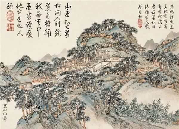第四开“万松山房”,所绘景致位于栖霞山主峰的半山腰。栖霞山麓多生松柏,“此尤蓊蔚”。每当山风谡谡吹过,万壑苍松鸣涛,绿荫丛中还有崇台杰阁。从中可见,此间“最为幽胜”。