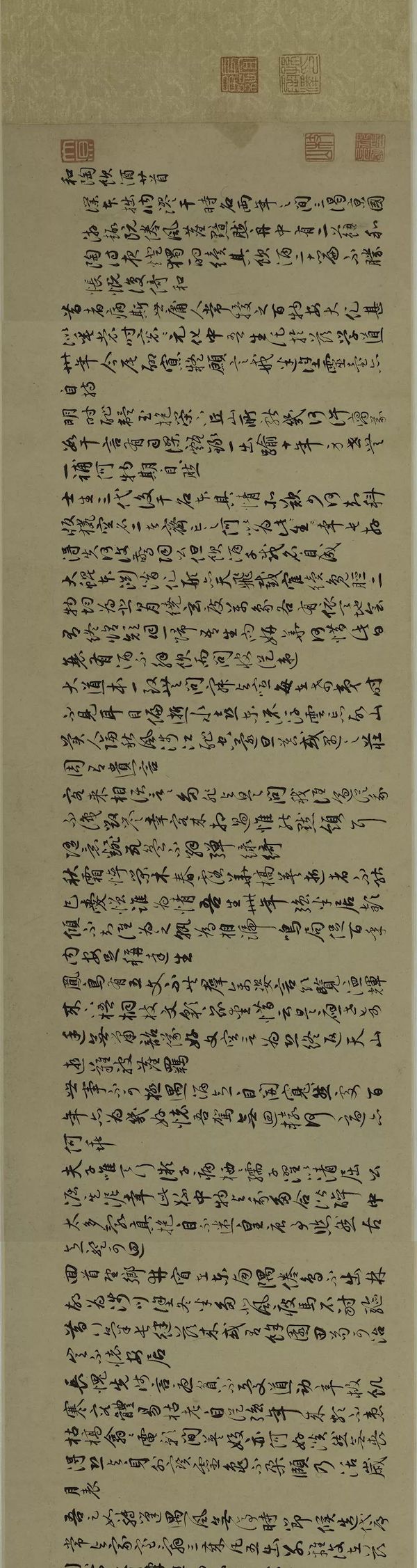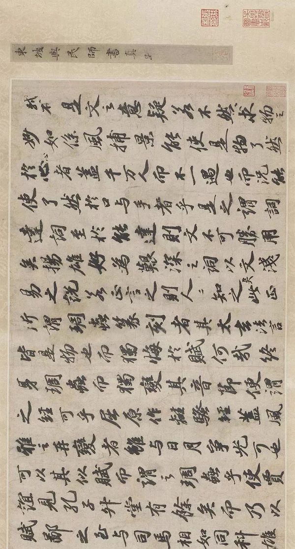 杨维桢(1296—1370),字廉夫,号铁崖,浙江诸暨人,擅行草书。此卷为真镜庵募缘而撰写,据考,真镜庵又称“珍敬庵”或“天隐子”,遗址在上海浦东高行镇。杨维桢晚年与僧道交往频繁,经常出入寺庙道院,且在松江、上海一带活动,此卷可作为证。此卷是杨维桢的行草书佳作,得唐宋人行草书真髓。其用笔矫健苍劲、跳宕古崛,章法腾挪多变、顿挫丰富,用墨浓淡互济、干湿对比,展现了杨氏作为文坛名宿的强烈艺术个性,以及他晚年炉火纯青的书艺。此卷为首次进入书法馆常规展陈列。