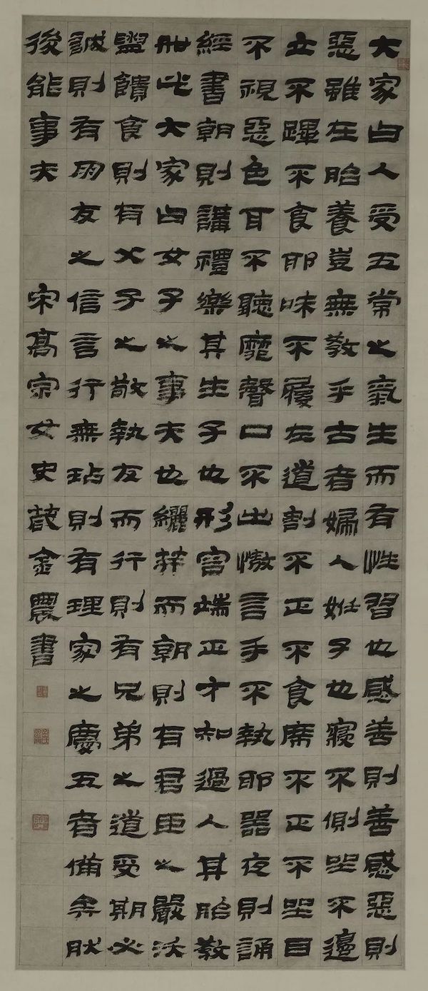 金农(1687—1763),字寿门,号冬心,浙江杭州人,久居扬州。“扬州八怪”之一,擅书画,书法以隶书见长,自创漆书。此轴据金农自题,内容为“宋高宗女史箴”,是他转变期典型的漆书作品。金农的隶书主要得益于《华山庙碑》,早年临摹还比较肖似原碑风格。他在多次临摹中逐渐加入了自己的强烈个性,并发明了独特的笔法,形成了横划特粗,竖划尖细的肥腴苍劲的风格。相对于他晚年成熟标准的漆书,此轴正体现了这种转换。此轴为首次进入书法馆常规展陈列。