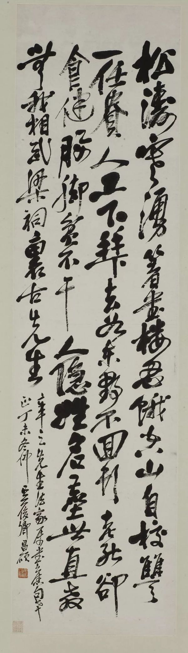 吴昌硕(1844-1927),初名俊,后名俊卿,字昌硕,号缶庐,晚年以字行。浙江安吉人,寓居上海。工书画篆刻,集“诗、书、画、印”为一身,融金石书画为一炉。吴昌硕的楷书从颜真卿入手,隶书学习汉碑,篆书学石鼓文,行书学黄庭坚、王铎。其书法作品,以篆、行、草为主,用笔雄浑、饱满,结字欹侧。行、草融入篆书笔意,故而笔势雄厚、气势飞动,开创了独特面貌。此轴书于1907年,作者时年六十四岁。内容为吴氏自作诗,书赠友人。此轴为首次进入书法馆常规展陈列。
