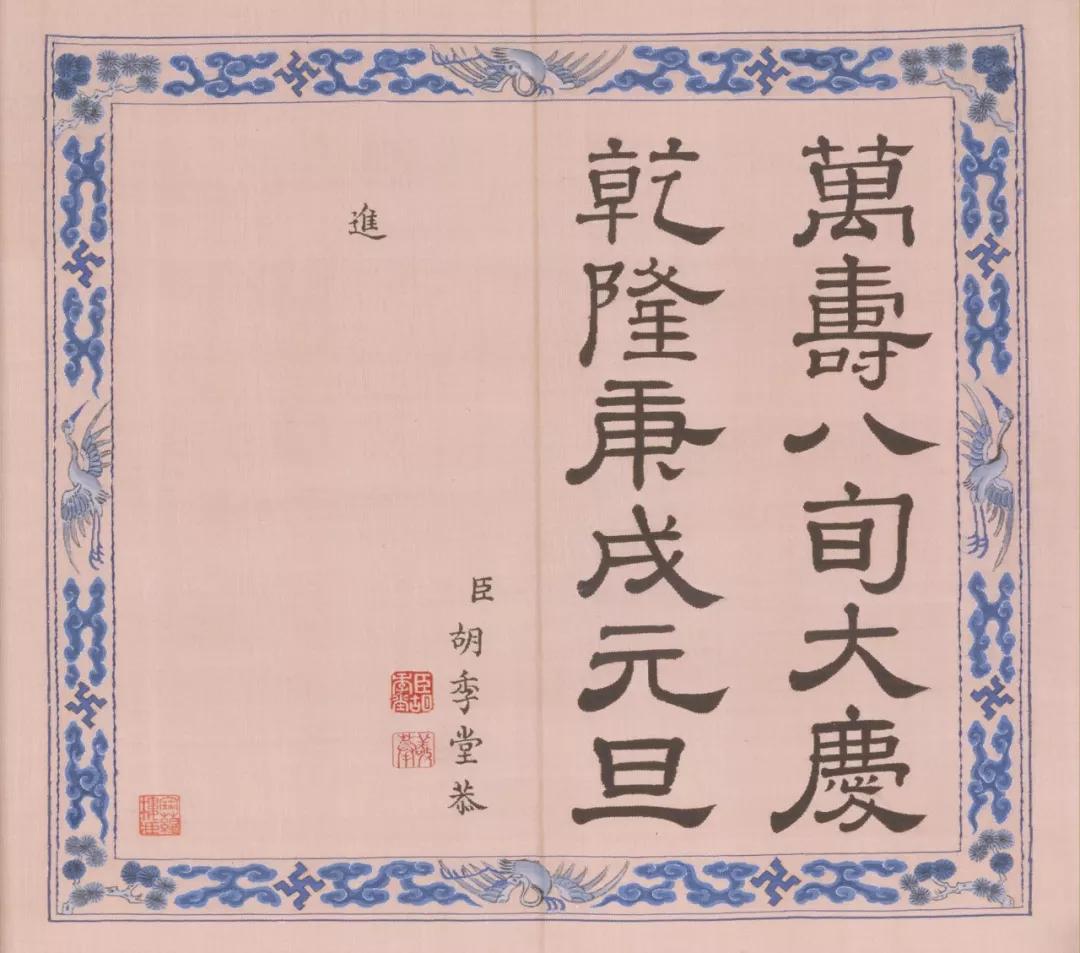 首开缂黑色“宝典福书”四字,末开缂隶书题“万寿八旬大庆乾隆庚戌元旦臣胡季堂恭进”,缂“臣胡季堂”和“敬摹”印,钤“宝蕴楼藏”印。