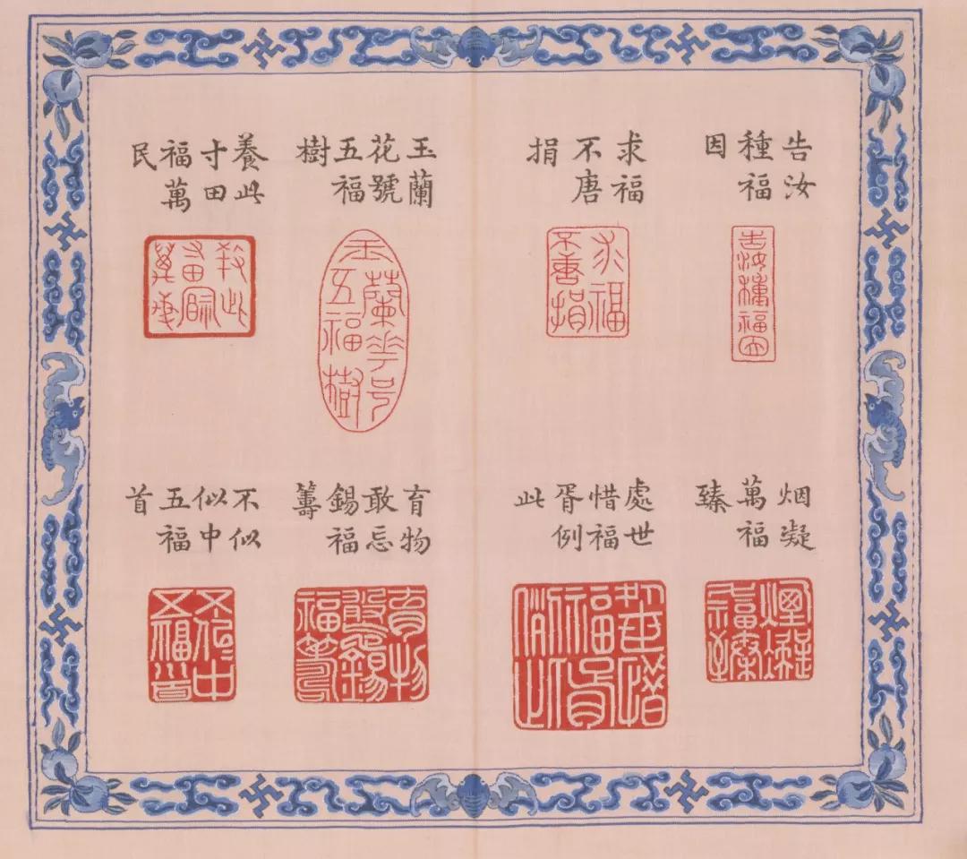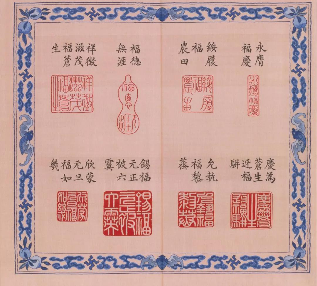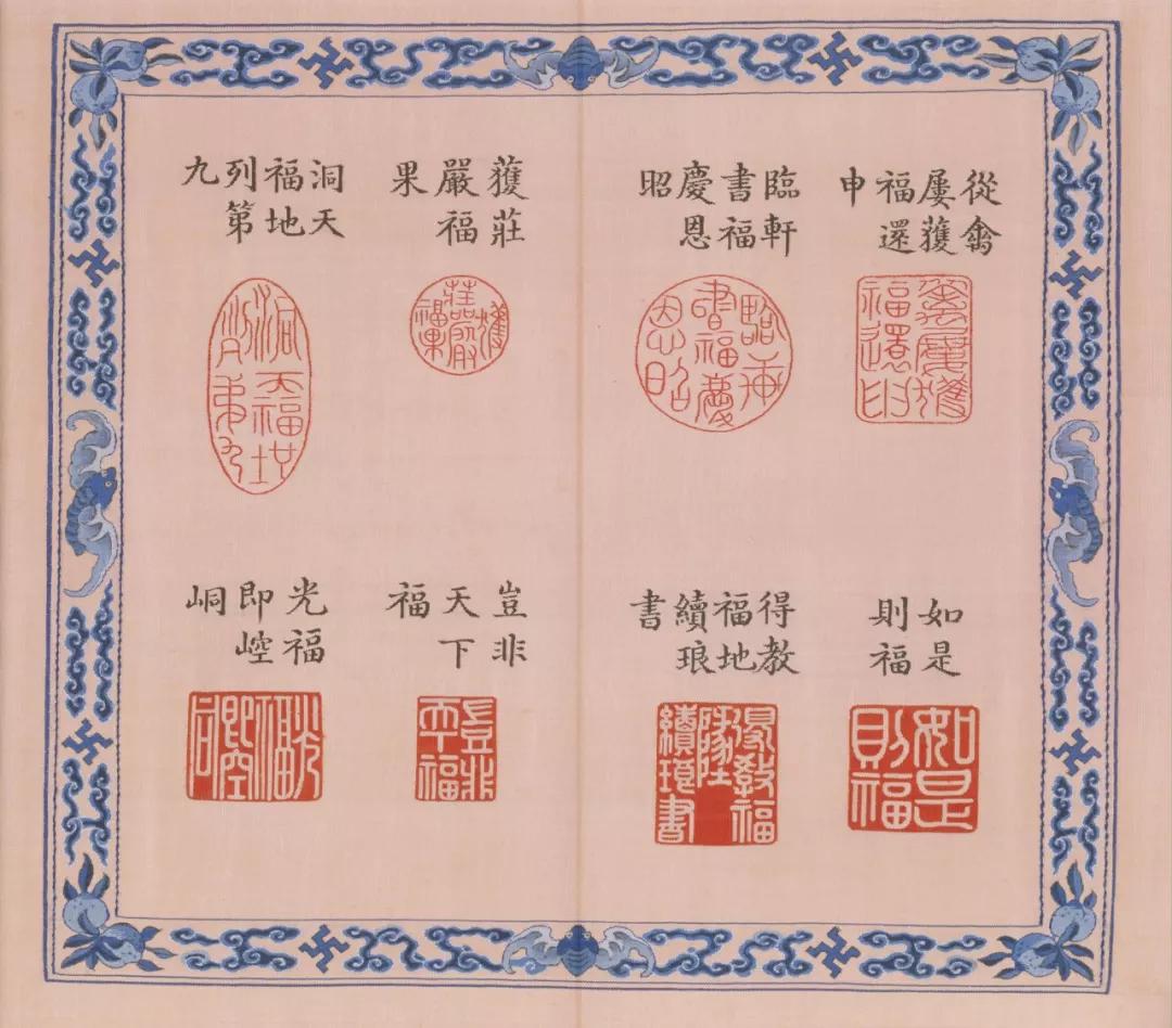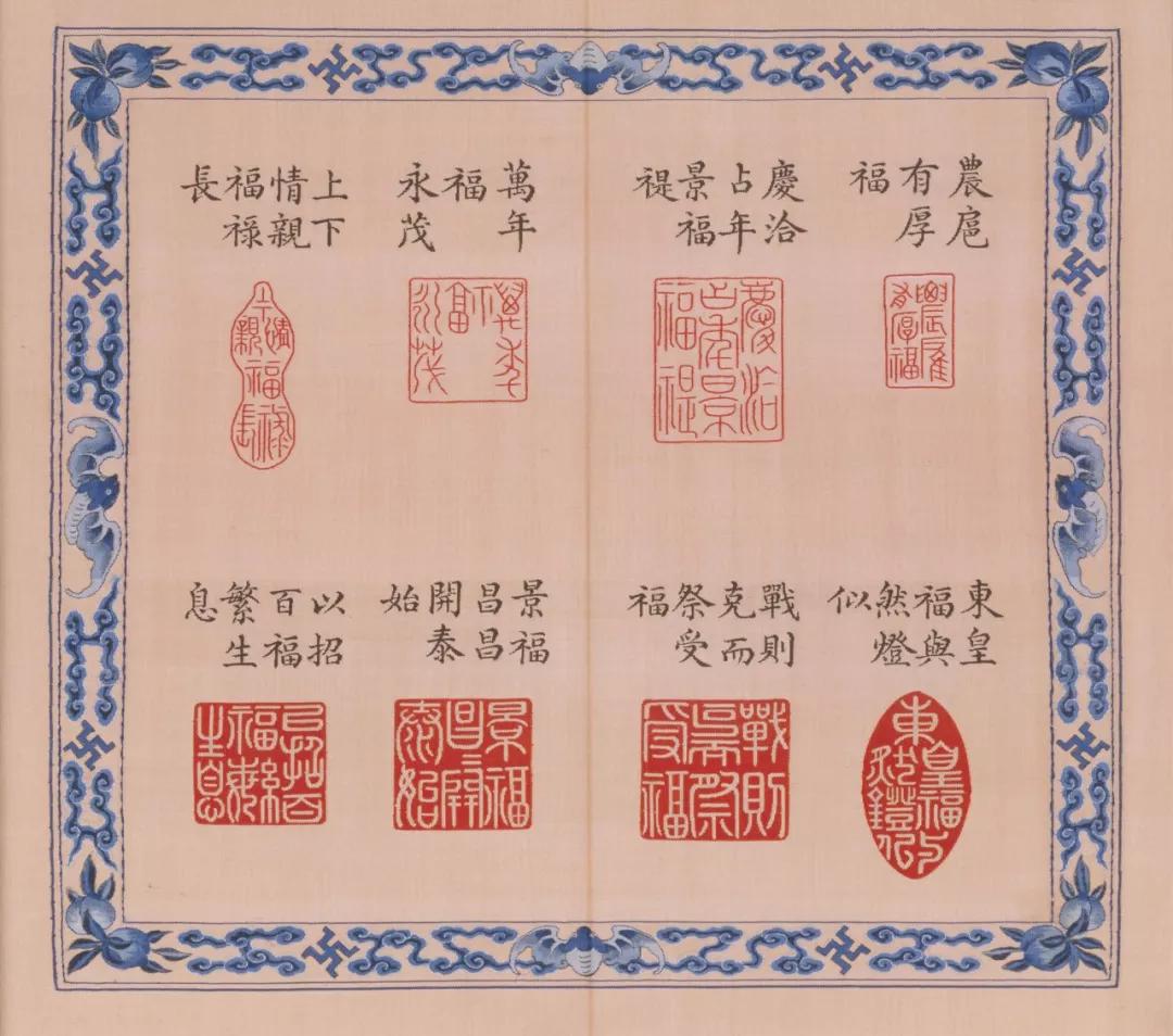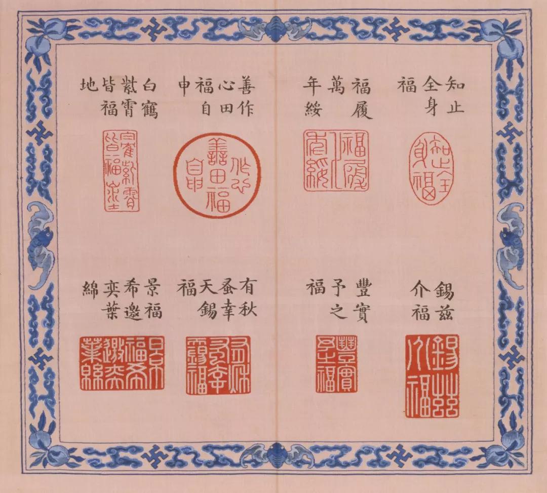 此册16开,缂织和刺绣朱、白文印章凡120方,每方印文均配以黑色丝线缂织的楷书释文,而每印的印文中均有“福”字。其中白文印均为缂织,运用齐缂和搭梭技法,朱文印绝大部分为刺绣,均用切针技法。印章形状丰富多样,有正方形、长方形、圆形、椭圆形、葫芦形、外方内圆形、外圆内方形、双钱形、不规则形等。印文字数4字至13字不等,以7字为最多。