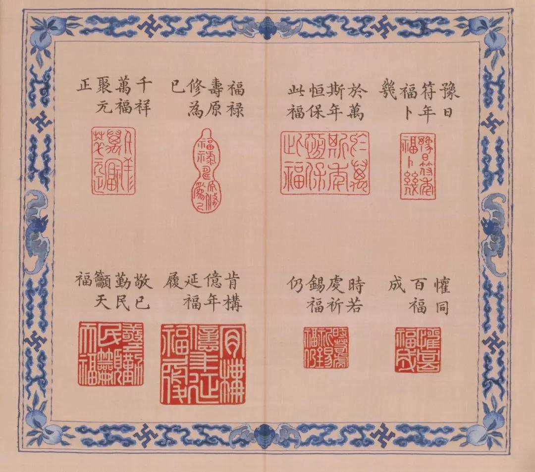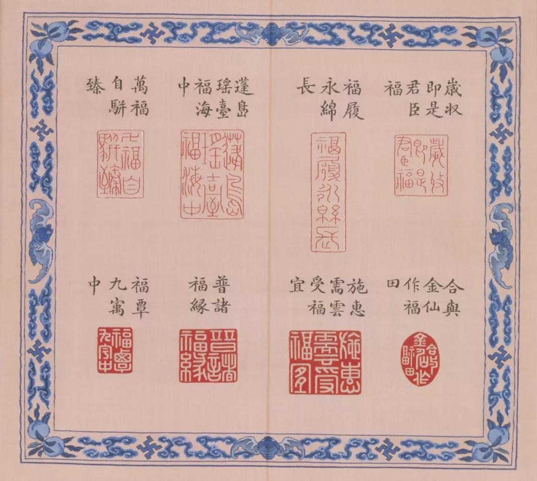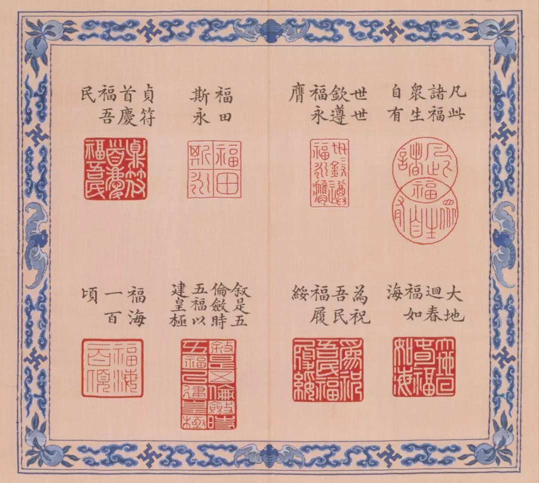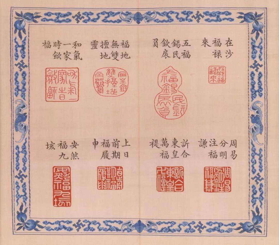 此册16开,缂织和刺绣朱、白文印章凡120方,每方印文均配以黑色丝线缂织的楷书释文,而每印的印文中均有“福”字。其中白文印均为缂织,运用齐缂和搭梭技法,朱文印绝大部分为刺绣,均用切针技法。印章形状丰富多样,有正方形、长方形、圆形、椭圆形、葫芦形、外方内圆形、外圆内方形、双钱形、不规则形等。印文字数4字至13字不等,以7字为最多。