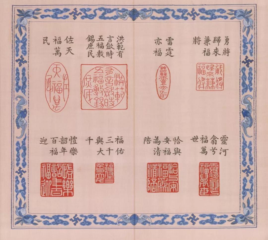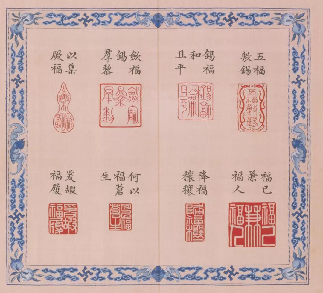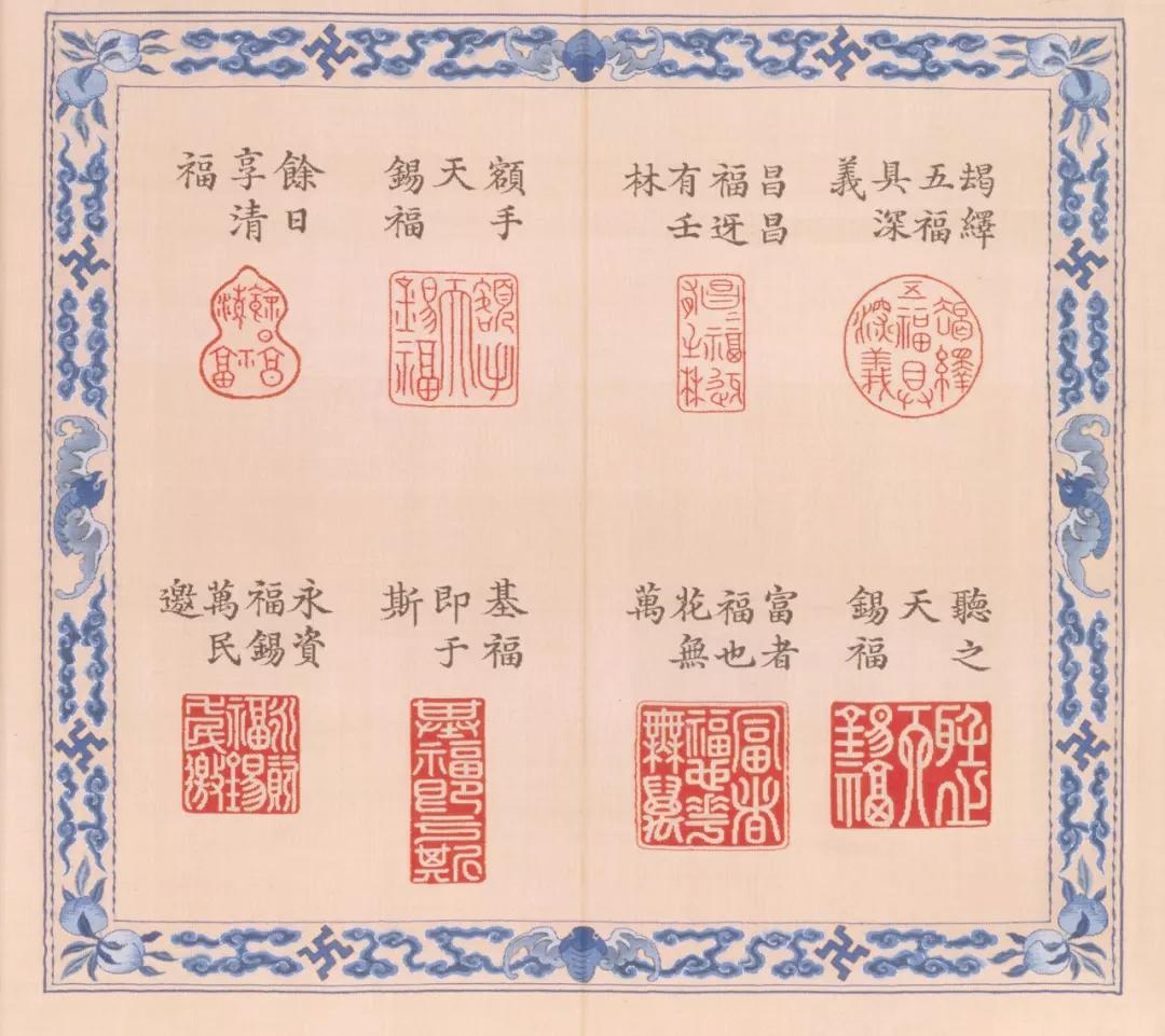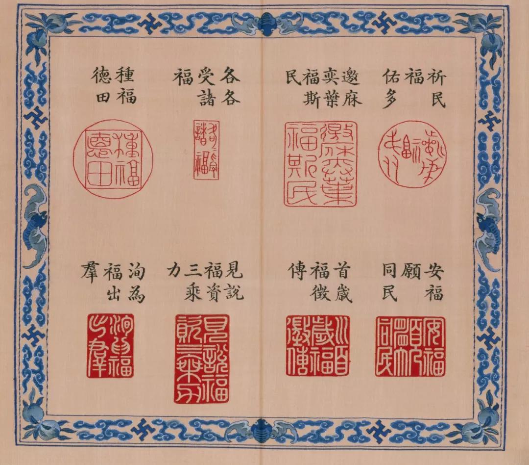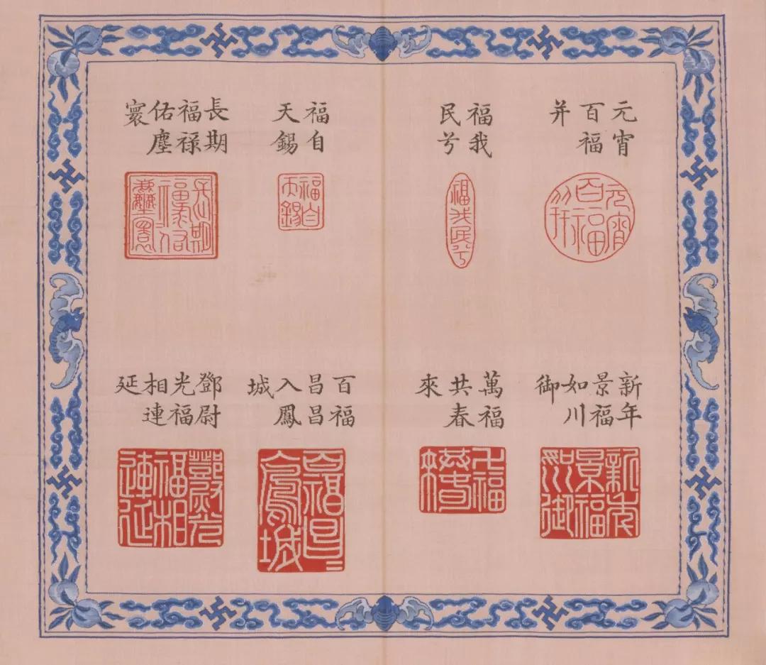 此册16开,缂织和刺绣朱、白文印章凡120方,每方印文均配以黑色丝线缂织的楷书释文,而每印的印文中均有“福”字。其中白文印均为缂织,运用齐缂和搭梭技法,朱文印绝大部分为刺绣,均用切针技法。印章形状丰富多样,有正方形、长方形、圆形、椭圆形、葫芦形、外方内圆形、外圆内方形、双钱形、不规则形等。印文字数4字至13字不等,以7字为最多。