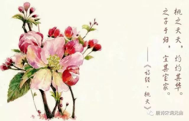 桃树蓓蕾缀满枝杈,鲜艳明丽一树桃花。一个姑娘就要出嫁,喜气洋洋要去夫家。