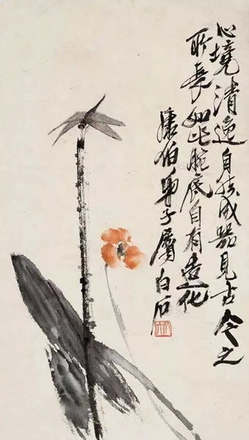 齐白石取法广泛,曾下苦工吸收近代诸家之长最终熔铸成了自己的风格,他说:“青藤八大远凡胎,老缶衰年别有才。我欲九原为走狗,三家门下转轮来。”他有两个办法学习传统,一个是“背”,即把看过的名家画作,用自己的方式背下来,再用自己的风格画出来,把别人的东西消化为自己的表达。第二个是“改”,见到好的造型,他会按照自己的情感把它改成自己的风格样式。