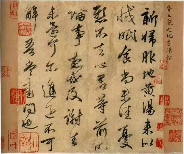 王羲之在遗世的手札书中的整体结构表现更是出神入化。由于在单字意识中即具有奇正相渗的理念,其字与字、行与行,上下前后的关系处置便变得得心应手。以《频有哀祸帖》为例分析,“频”字左右略开,“有”字紧收拉长,“哀”字摆正,“祸”字重心趋右。虽四字未有牵连,且间距较大,但极贯气。这种间隔在末行“增”、“感”字之间找到呼应,其间还有“催”、“切”之间,“割”、“不”之间,“自”、“胜”、“奈”字之间的间隔作为过渡协调。而“不能自”,“奈何奈”、“省慰”字之间的牵带则打破了前例字与字之间的间隔,这既是一种对比,又是一种协调,大大丰富了布字空间的灵活性和多变性。