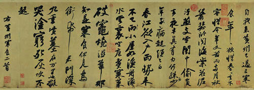 二:节奏美。一般人录自己的诗,写一两首,基本风格都是一致,起伏感没有那么强。东坡写这个作品,是随着他的情绪变化,开始沉稳,越写越激动,写到中间部分,就已经出现了高潮。他的情绪一激动,他的字也大了,开始饱满、恣肆,但是到了最后收尾,又开始慢慢恢复平静。这正好是有一个起伏感,说明诗人不仅情绪上达到了波澜壮阔的境地,他的理性更能控制自己的情绪。