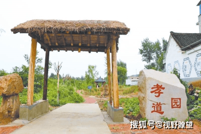 而在该村文化广场西北角,一个用茅草顶搭建的门楼格外引人注目,门口一块大石头上刻写的“孝道园”三个红色大字苍劲有力。沿着弯曲的鹅卵石甬路前行不远,一个古朴的孝道亭赫然出现在眼前;周边农户家的院墙上,几幅反映孝道故事的墙体画图文并茂、栩栩如生。