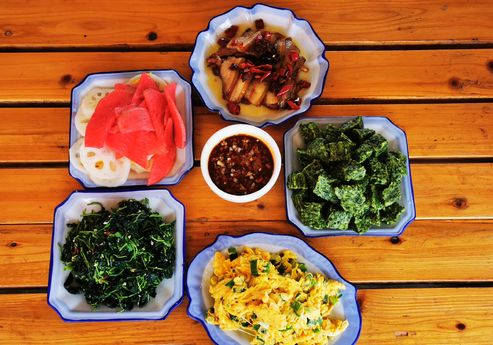 我们在一家“胖嫂”农家乐落座,要了几个农家菜,除了桌上几样,还有一大盘烧土鸡和煎饼。
