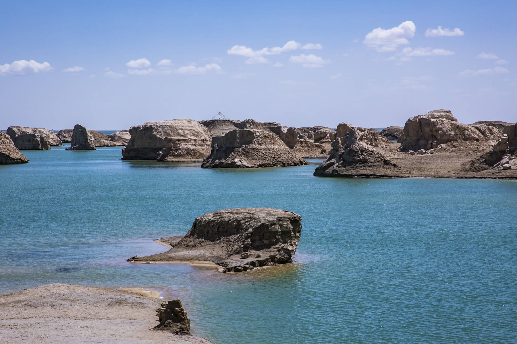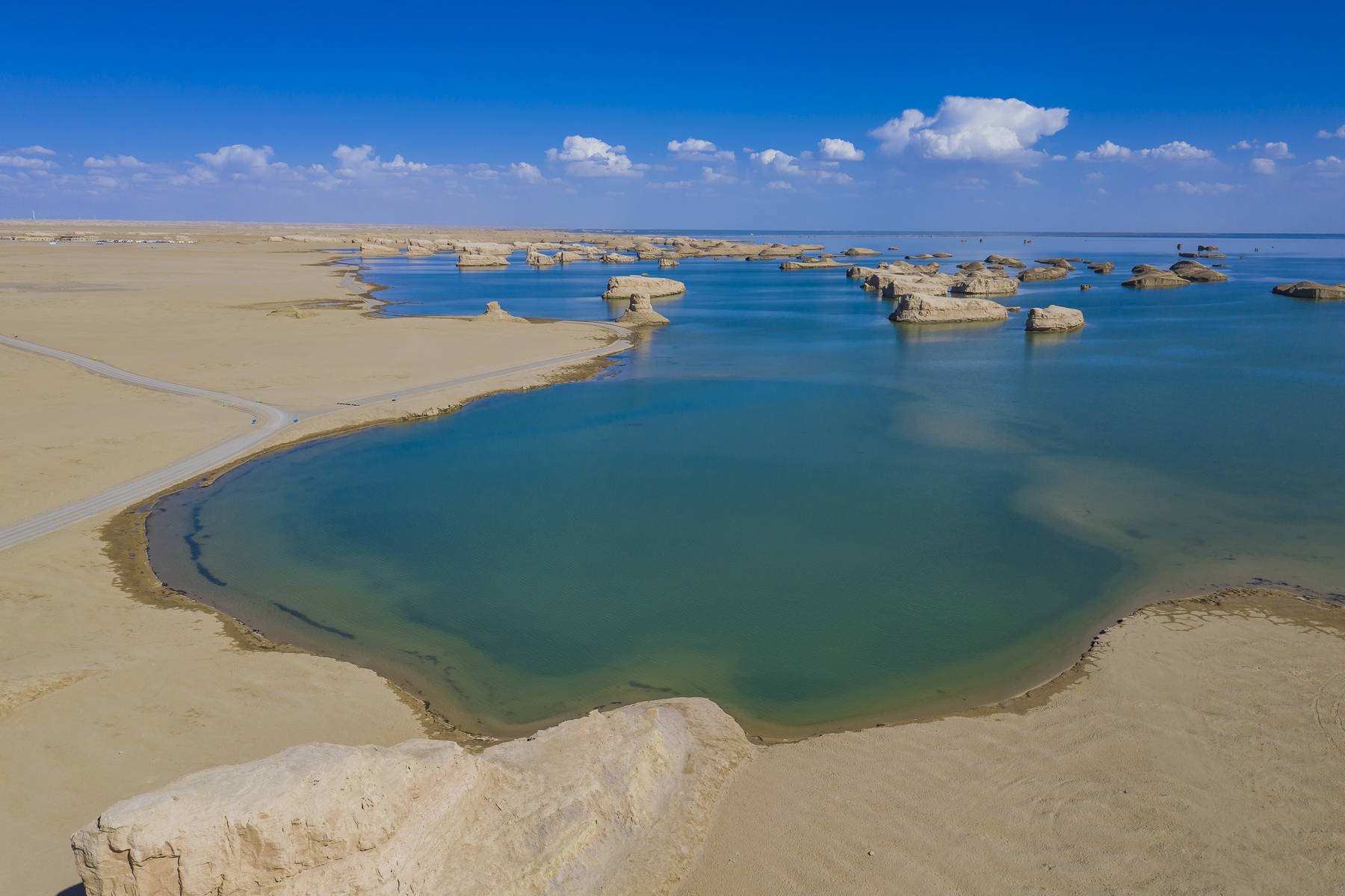 从青海第二大城市格尔木出发,向西北大柴旦方向,三个小时车程就可以到达水上雅丹。雅丹是一种典型的风蚀性地貌,在这里放眼望去,碧波荡漾的湖面上,散布着成群的、形态各异的“小山丘”,真的是蔚为壮观。这样的地貌是湖泊沉积物所形成的地面,经过千万年的风化作用、间歇性流水冲刷和风蚀作用,形成的风蚀土墩。