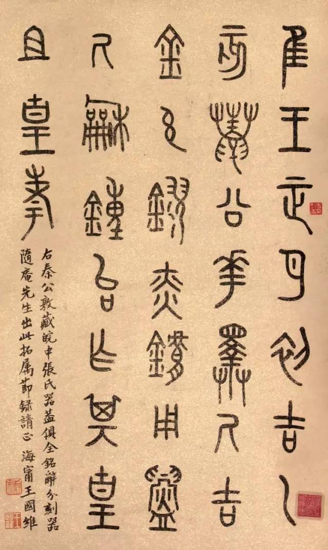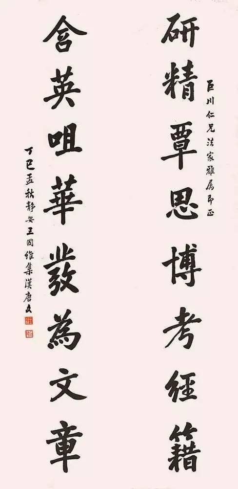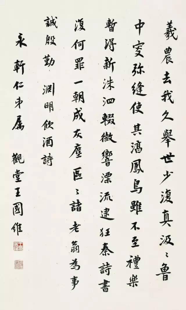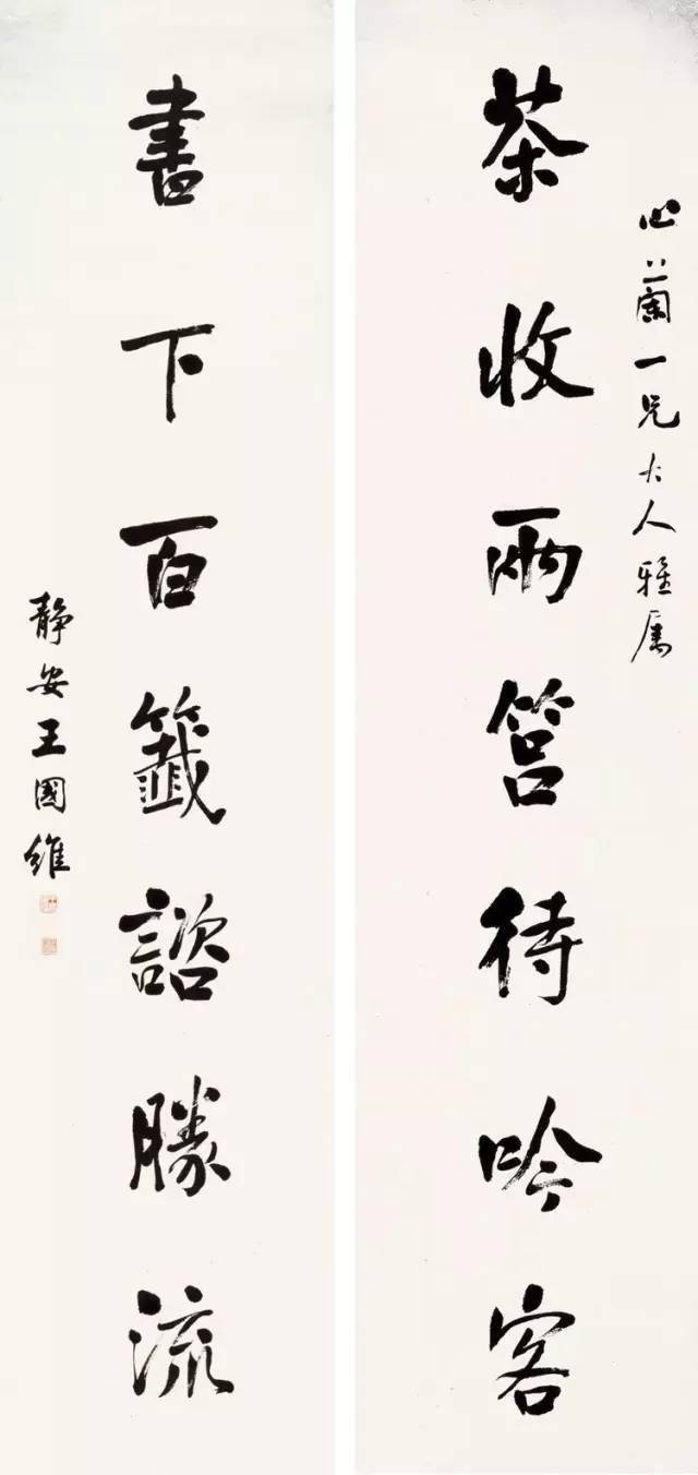 王国维(1877—1927),字伯隅、静安,号观堂、永观,汉族,浙江海宁盐官镇人。清末秀才。王国维书法诸体皆能,造诣精深的是其小楷、行书。其小楷取法钟繇、二王及颜鲁公,起点高,路数正。他重视结构、用笔,讲究一个字、一行字和一页字的协调性,不以怪大,不以奇胜。他的行书亦从二王及颜鲁公来,又吸入宋人的气息,严谨、精致,线条富于变化,字有动感。他的墨迹,基本上是书稿、尺牍、笺书、便条等,幅度不过盈尺,字型只有一厘米大小,结构谨严,章法疏密得当,笔力遒劲,做文章读,铿镪有力,当书法看,赏心悦目。