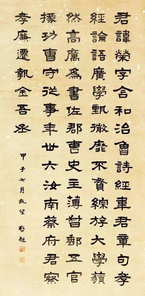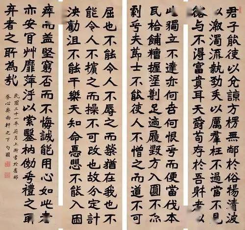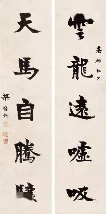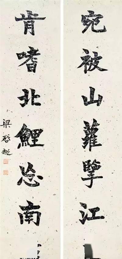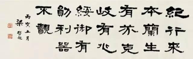 梁启超(1873年~1929年)早年研习唐楷欧阳询,后从学于康有为,宗汉魏六朝碑刻及汉代隶书。其取法北碑的书法理念深受康有为影响。梁启超的书法,属于学者类型,但又与一些以行草见长的学者型书家不太一样。他在文、史、哲方面的成就太高,梁启超在北碑上有相当高的造诣,在隶书创作方面也有极高的成就。