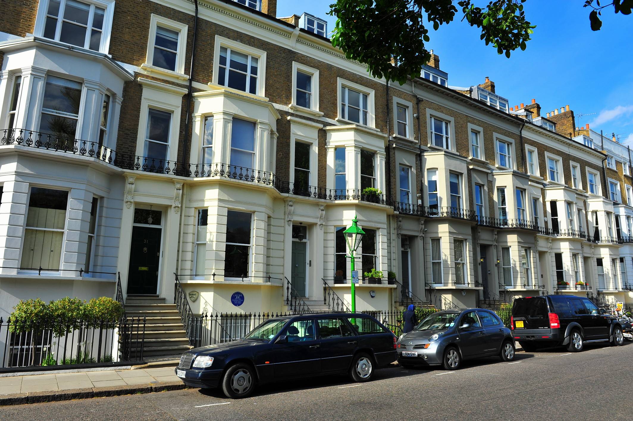 老舍这所故居的位置在伦敦市中心,距离肯辛顿皇家公园和著名的海德公园都不远。我们搭乘红线地铁到达荷兰公园站(Holland Park),出站右转,沿着荷兰公园大街走不到500米,再右转进入Addison Avenue,走250米就能看到路尽头的一座哥特式教堂,这就是圣詹姆斯教堂。附属于它的一个小花园即圣詹姆斯花园,围绕这个花园的一圈小路,就是我们要找的圣詹姆斯花园路。路边均为联排别墅,老舍居住的31号,大概位于花园正北一排差不多20联排别墅的中间位置。在伦敦市中心,是极难找到所谓独栋、双拼、四联排、六联排这些国内流行的别墅样式的,能有个20联排的住宅,无论是在当时还是现在,也都算是中产阶级的居所了。
