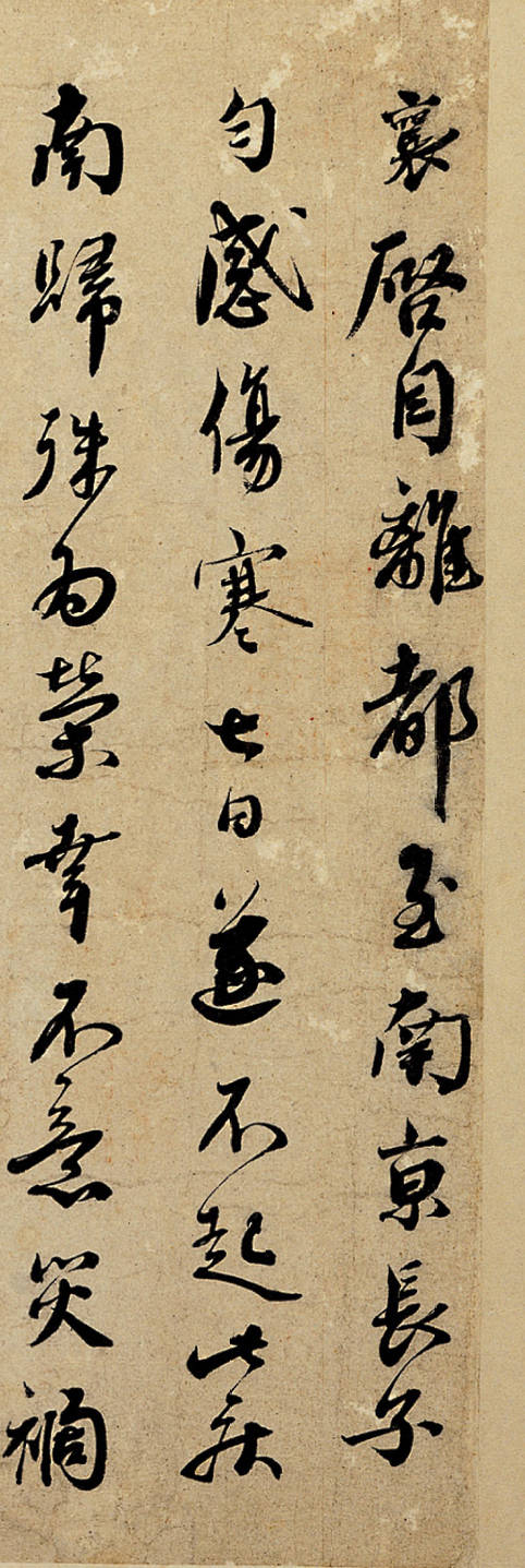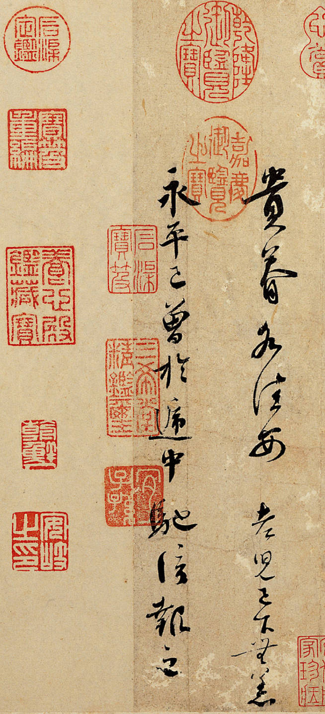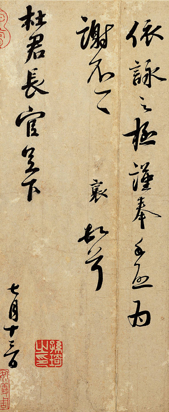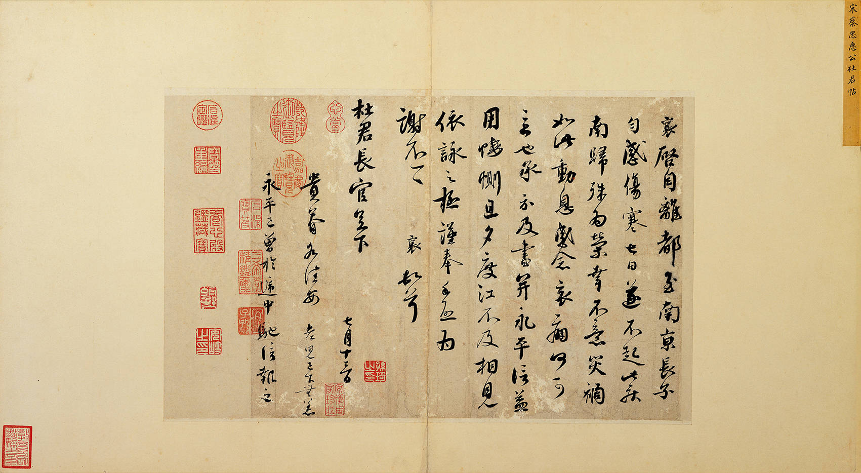 蔡襄《致杜君长官尺牍》,纸本,纵29.2cm,横46.8cm,中国台北故宫博物院藏。此帖又名《离都帖》,作于至和二年(1055年),乃蔡襄即将渡长江“南归”途中所书,追述离都(开封)行至南京(今商丘)而痛失长子。友人来信慰问,襄作此书答谢。