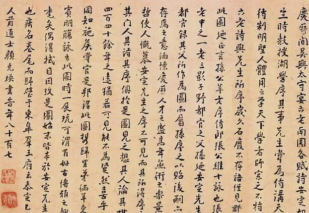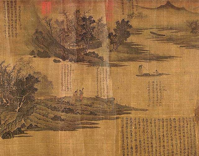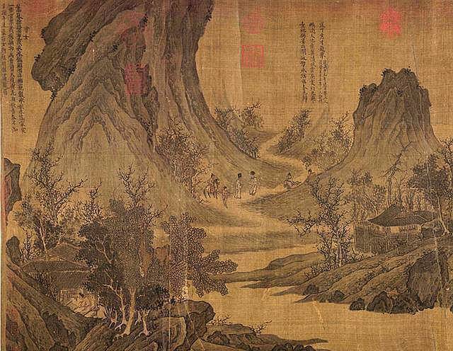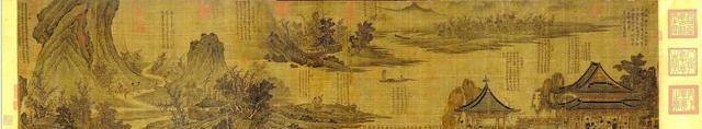而且这幅画的题跋还是由乾隆皇帝亲手题写,宋元陈直斋、鲜于枢等四人做了长跋。画中除了描绘山水风景外,还画了26人、两匹马、一只仙鹤。除了有乾隆皇题的御首外,还有宋代丞相贾似道、明洪武内府、清代三个皇帝等多方印章,大抵是物以稀为贵的缘故,这一幅画不仅成为皇室的珍贵收藏品,而且受到历代名家的高度评价。