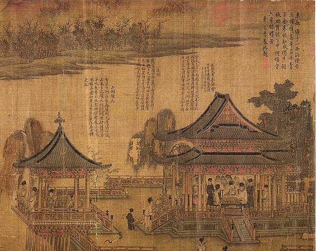 再说这《十咏图》,到底什么来头呢?为什么慈禧会这么喜欢呢?其实这幅画是北宋画家张先于北宋熙宁五年创作的一幅绢本设色画,因怀念父亲,翻看父亲生前所作的一首七律《吴兴太守马大卿会六老于南园人各赋诗》,诗中最后两句写道:“它日定知传好事,丹青宁羡洛中图”,从中受到启发后创作了这幅《十咏图》,而且张先的这幅作品无论是历史流传还是文献记载,仅此一幅,可以想见,这幅画到底有多大的价值。