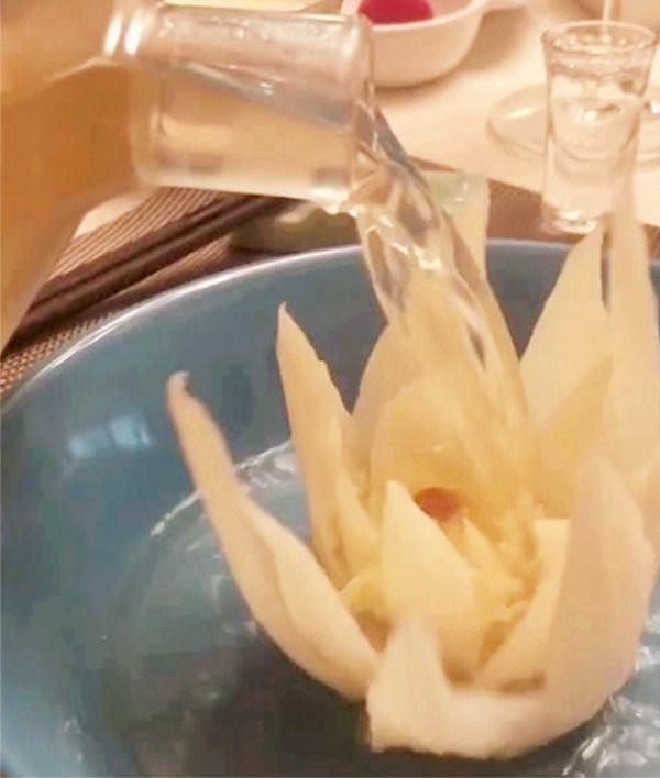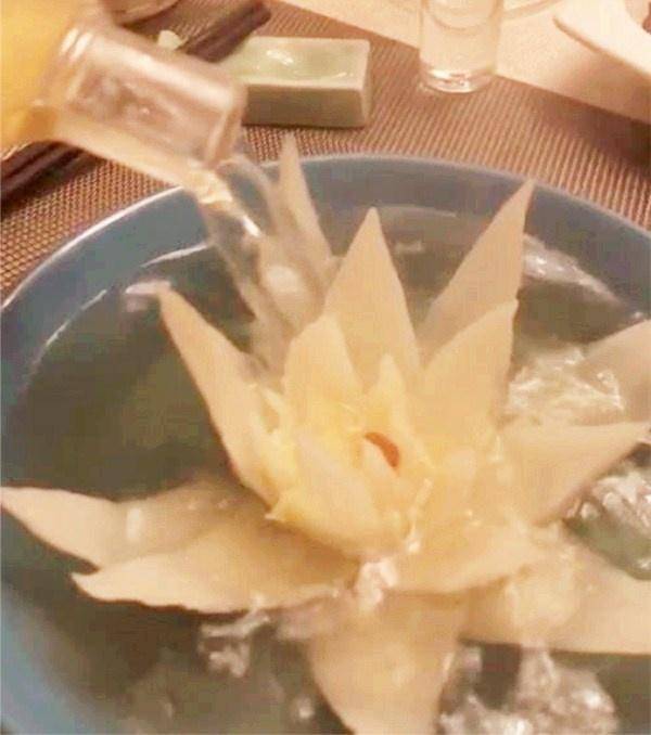 其实不是这样的,这开水白菜看上去是很简单,但是做法极其复杂,这到菜刚上桌的时候,盘子里的白菜就像是一个含羞待放的花骨朵,旁边的服务生会往盘子里倒入开水,随着开水的进入,白菜慢慢的张开花瓣,最终形成了一朵美丽的花,不仅如此,花朵中心还有一粒枸杞,看起来就像是花蕊的一样,给它增加了三分艳丽。