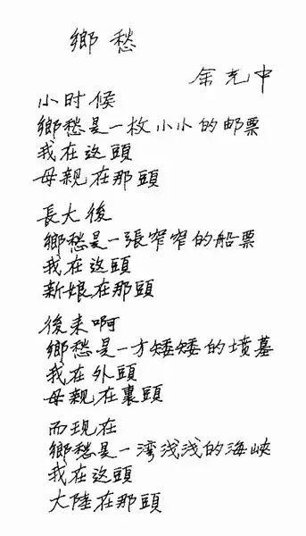 余光中,当代著名作家、诗人、学者、翻译家,是一位有广泛影响的文学大师。我们熟知的诗歌《乡愁》就是他的作品,下面是《乡愁》的手稿,可以看出余光中的书法功底。