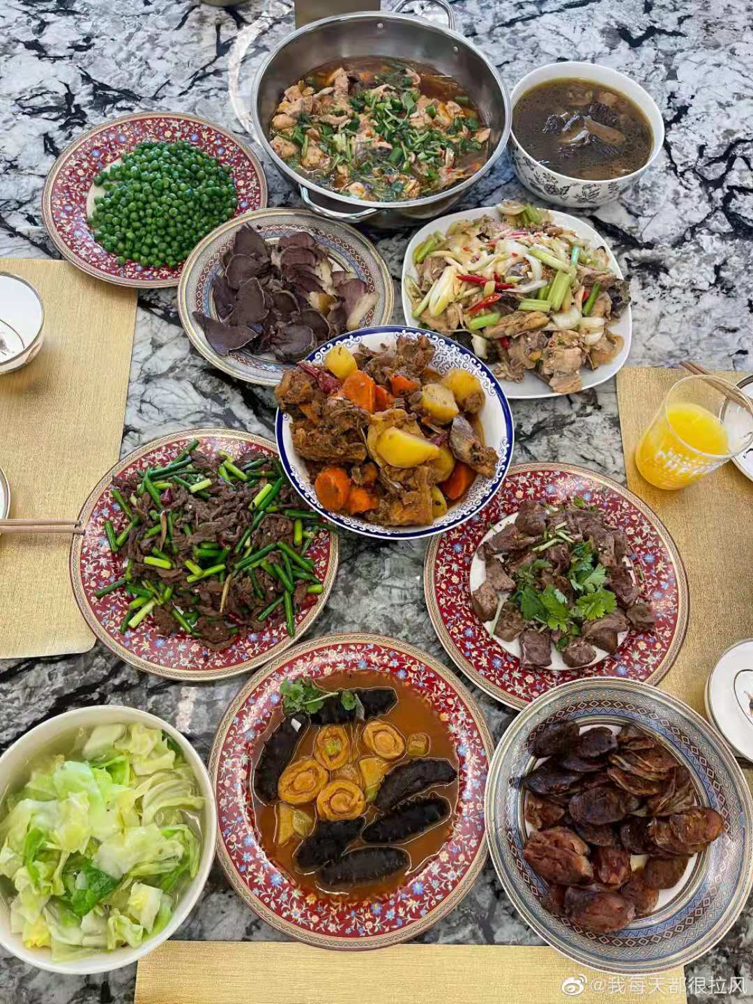 早就听说东北人爱吃炖菜是出了名的,各种食材都能拿来炖,所以我也怀着好奇打开他的微博看看他家的年夜饭。但是在他家的餐桌上,24道菜里面还真找不出几道炖菜。这桌菜一眼望去很家常,和我们平时吃的家常菜都差不多。