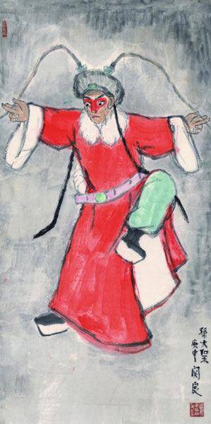 其二就是关良的绘画手法在专业的角度是被称为“求传神而不求形似”,这也是他个人的绘画风格,拿傅抱石的皴法,张大千的泼墨法对比,关良这一种只求传神的绘画理念虽然表现比较稚拙,但其造型远远不是他的重点,相反这一种绘画手法成了他绘画的最大特色。