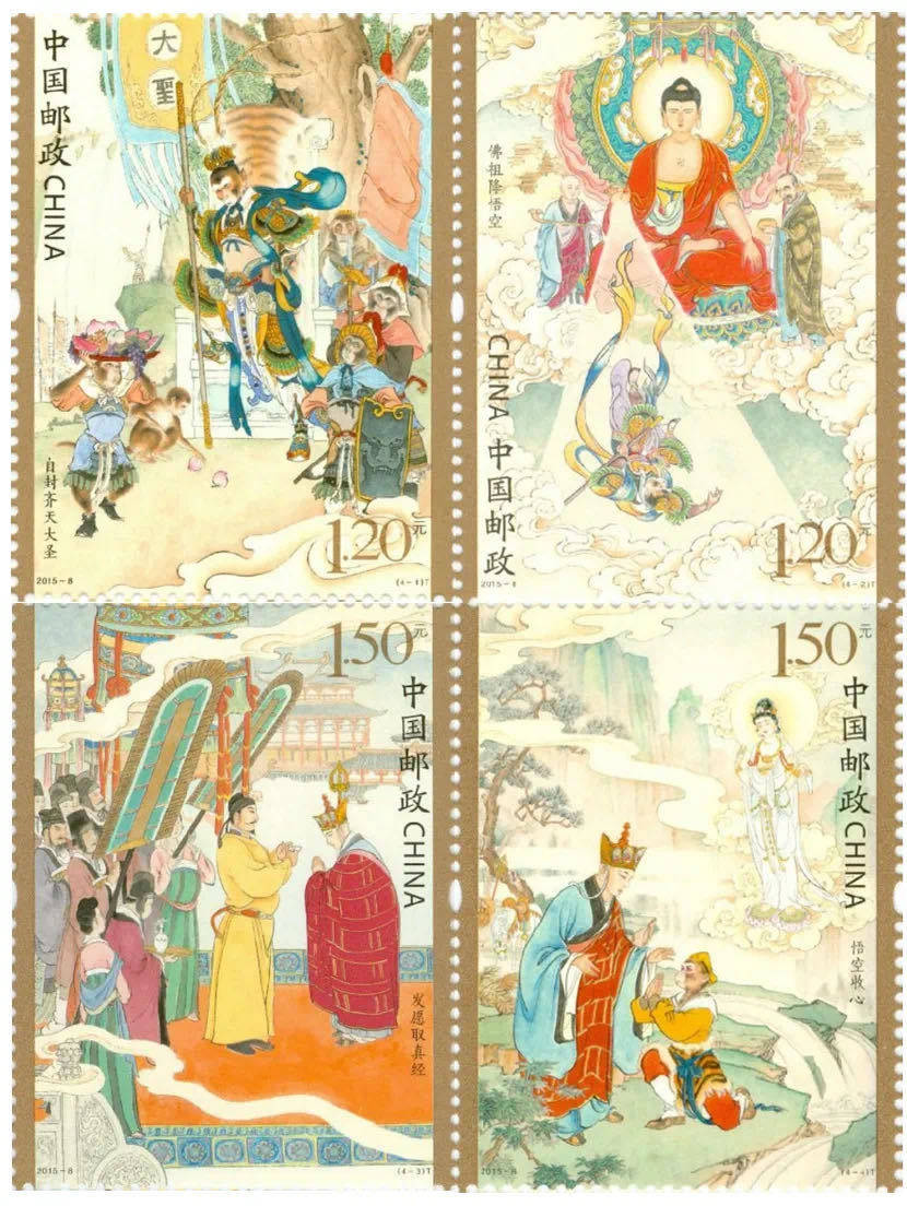 2015-8中国古典文学名著—《西游记》(一)发行日期:2015年5月3日设计者:李云中特种邮票1套4枚,小型张1枚