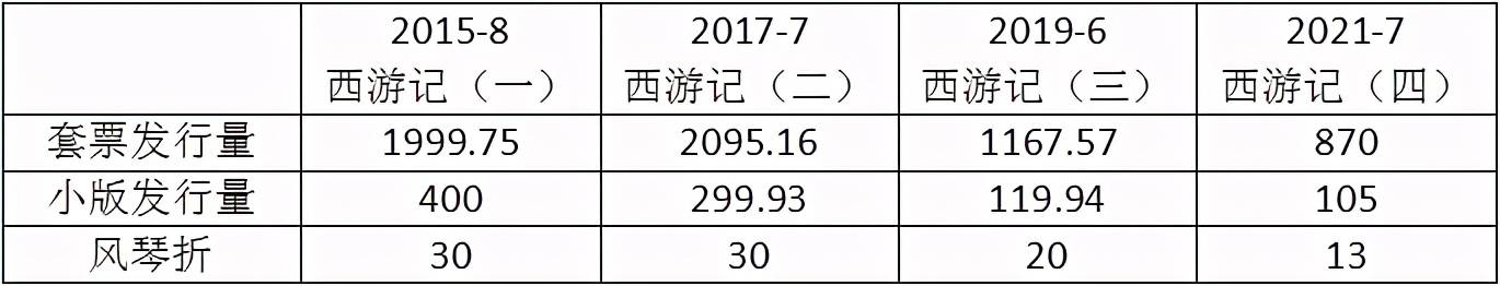 据中国邮政公布最新发行量来看,《中国古典文学名著——<西游记>》(四)特种邮票是该系列刷新历史最低记录,2015年发行的《西游记》第一组为1999.75万套,而在2017年发行的《西游记》第二组为 2095.16万套,2019年发行的《西游记》第三组则为1165.57万套。即将发行的《西游记》第四组发行量低至870万套。